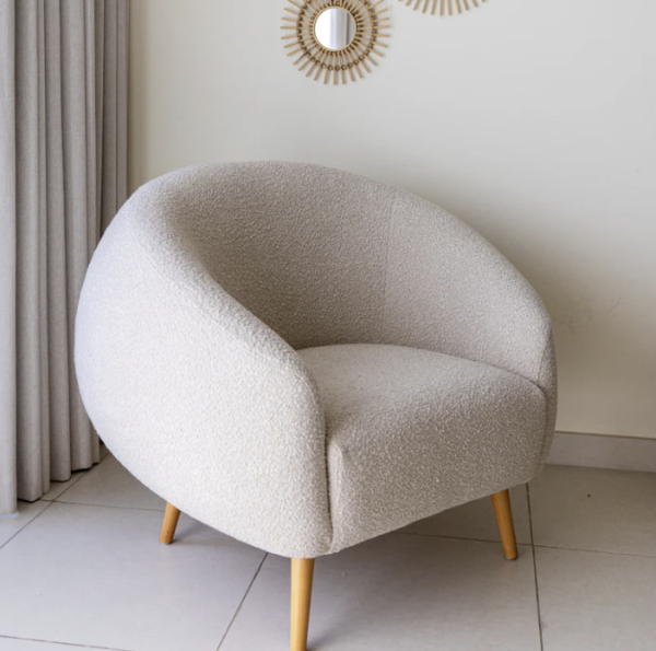 Has a seat ever looked so inviting? Upgrade your living room, with this white fabric and wooden armchair. Upholstered in boucle, a soft and incredibly comfortable fabric, this is the perfect private spot to wind down at the end of the day.